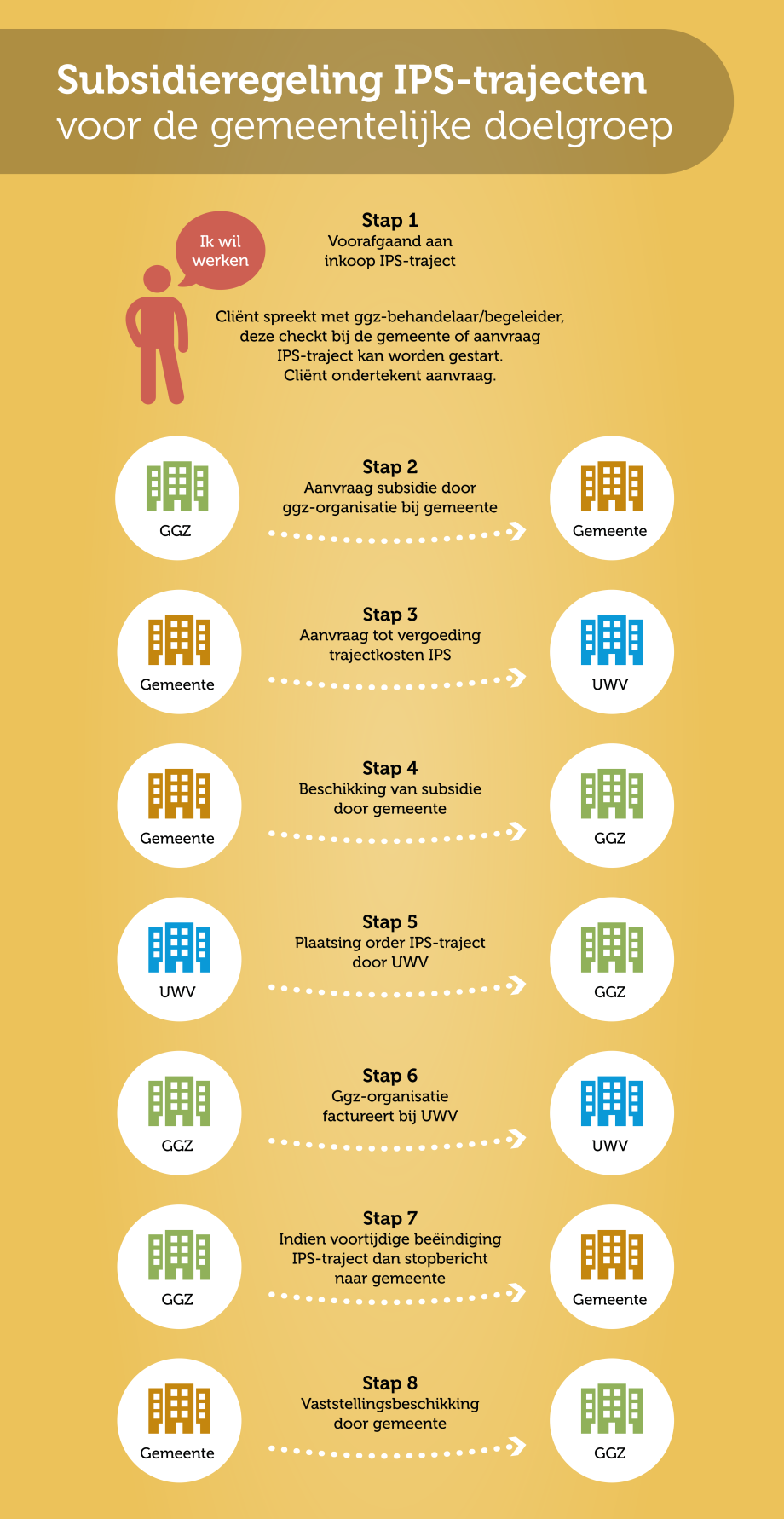 Een gemeente kan bij UWV subsidie aanvragen voor een IPS-(re-)integratietraject wanneer een ggz-instelling een kandidaat voordraagt bij de gemeente. Meer informatie over deze regeling vind je onderaan deze pagina.