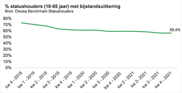 Het percentage statushouders in de bijstand neemt af. Eind 2021 heeft 56,4% van de statushouders een bijstandsuitkering. Eind 2020 lag dit percentage nog op 59,3%. De daling in de laatste periodes wordt veroorzaakt door het hogere percentage statushouders dat betaald werk heeft.