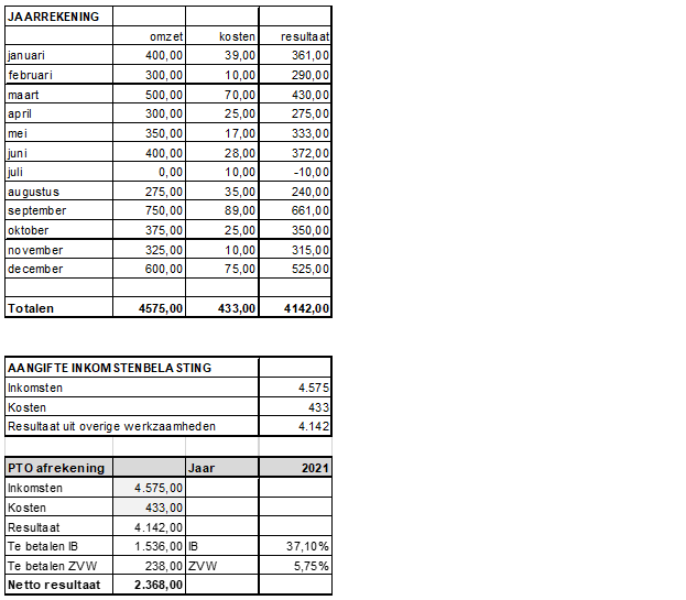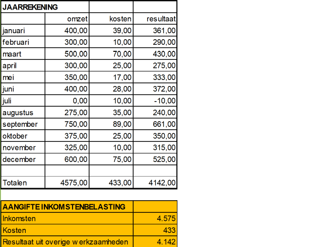 Tip! De administratietool van Zwolle en Leeuwarden kun je hier downloaden voor eigen gebruik (xls). In de oranje cellen in de tabel hieronder is onder ‘Resultaat uit overige werkzaamheden’ direct te zien welk inkomen moet worden opgegeven bij de belastingdienst.
