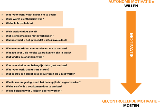 Bij het verkennen van de motivatie richt je je in eerste instantie op autonome motivatie (willen). Maar als die er niet is, ga je op zoek naar meer gecontroleerde motivatie (moeten). De vragen van de Motivatieladder helpen motivatie bloot te leggen.